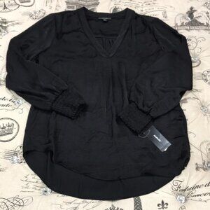 Alfani takes your look beyond basic with this softly shaped top designed with a V-neck and smocked cuffs.