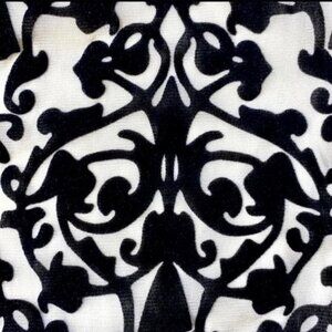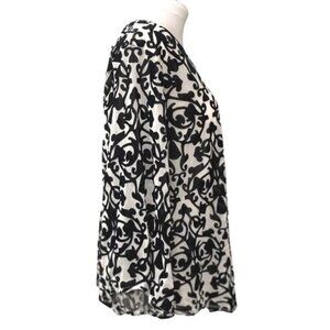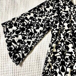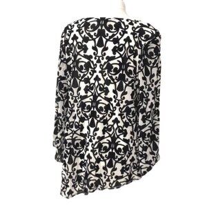 style tags: Alfani, damask, black & white, flocked damask, striking, bold, beautiful, flared sleeve, lined bodice, asymmetrical, relaxed fit, flowy. Women's size XL
