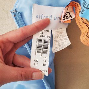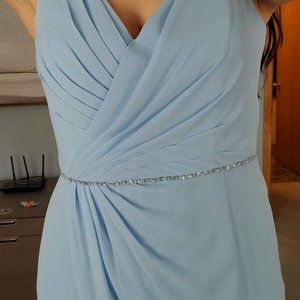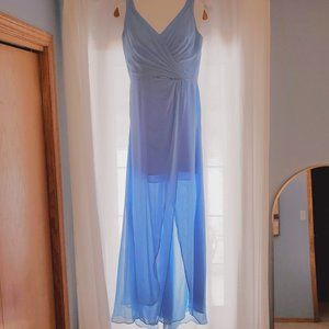 Beautiful light blue bridesmaid or prom or graduation dress! Colour is "Blue Jay" from Alfred Angelo. Chiffon, lined to the knee with leg slit in the front as shown.