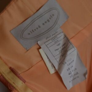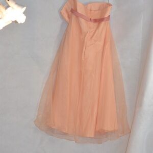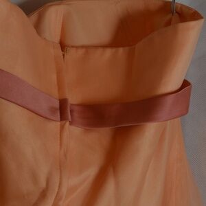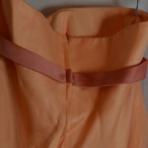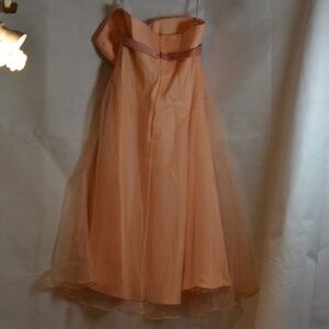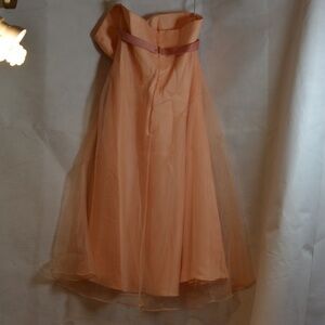 Great for a wedding or a summer event such as a wedding! Strapless, peach in color with a pretty satiny bow under the bustling. It has an organza top of layer over lining. Is soft, pretty, feminine.SZ 14 US b Alfred Angelo