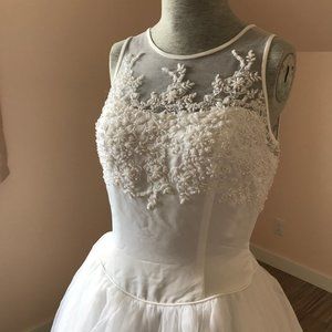 Alfred Angelo white wedding gown has satin bodice with mesh shoulders & back and beautiful beading & embroidery detail. Tulle skirt train has satin trim with beading & embroidery detail along the hem. Mesh back has zip closure at the lower back with covered button closures along the upper back. Tag size is US 6, see below for garment measurements. Bridal shop sample gown, has not been worn, light wear from storage.