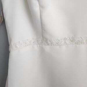 Off-white, no defects and in perfect condition. Includes a detachable train that hangs off the shoulders. I believe the dress is polyester and the train is chiffon. Three layers of fabric in the skirt as pictured.