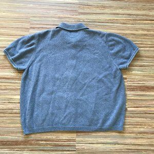 Vintage Alfred Dunner short sleeve cardigan sweater in blue heather color with ribbon embroidery detail. Pretty floral embroidery has beaded accents. Collared neckline with flower-shaped button front closures. 55% ramie/45% cotton, tag says hand wash. Tag size is women's "2X" - see below for garment measurements. Very good pre-owned condition.
