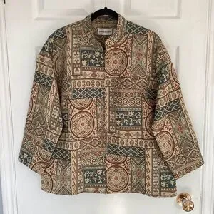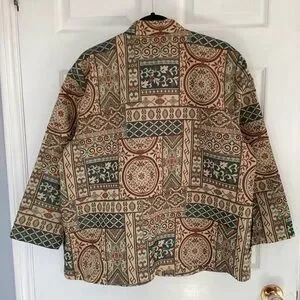 Elegant jacket with intricate multicolor patterns. Features a button-up design. Ideal for a stylish look.