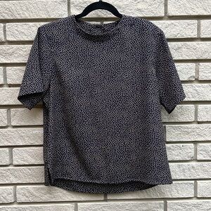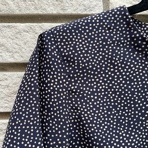 Navy blouse with camel coloured polka dot style pattern (but not actually ‘dots’, the dots are shaped like squares). Has shoulder pads which can be cut out easily, if desired. Short sleeves with buttons at back of neckline. Little side slits at bottom to help it hang straight through the body to hips.