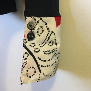 Very good preowned condition, dark navy blue button up, V-neck cardigan with cute buttons and separate floral printed fabric at the sleeves cuffs in tan, red and navy blue on white. Pure 70s, 90s vibes. Cuffs can be worn rolled up or down. The shirt is closed at the top, so buttons are not really functional, but just for show. I believe this is made by Alfred Dunner according to the CA code. Please let me know if this is incorrect.