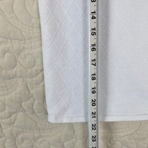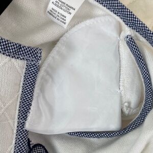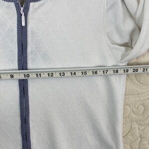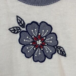 Alfred Dunner Fooler Sweater. Women's tag size Petite Large (see photos for measurements). Ramina / cotton blend. Tight knit. White with blue houndstooth trim and embroidered flower on chest. Fooler top with zip up front. Three quarter sleeves. Shoulder pads are stitched in at two points - easy to remove if desired.