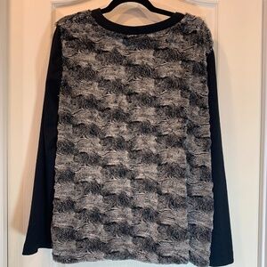 Comfortable zip-up top from Alfred Dunner featuring a textured front panel in black and grey tones with solid black sleeves. Easy to wear and flattering, this piece works well as a light jacket or layered top for everyday wear. A practical and stylish option for a polished casual look.