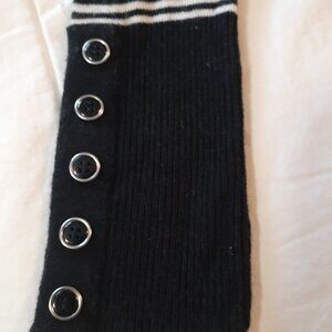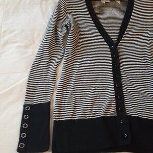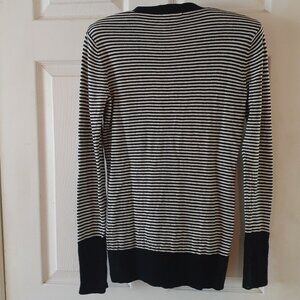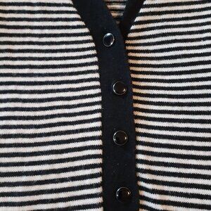 Pre-owned, extra small, Alfred Sung cardigan in black and white. Good condition. Black and white striped long button up cardigan. Black and silver buttons. Cotton 90% and cashmere 10%.