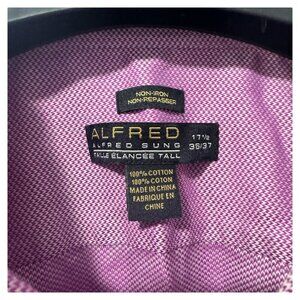 Pit to pit 25" Length 32" Neck 17.5 Elevate your wardrobe with the Alfred Sung Men’s XL dress shirt, showcasing a sophisticated purple/pink tone that adds a touch of colour to your professional ensemble. This shirt is designed for the discerning gentleman who values both style and comfort. The regular size ensures a fit that is both flattering and easy to wear for a variety of body types.Featuring a button-down collar and long sleeves, this shirt offers a classic look for any formal or business occasion. The subtle shade makes it an excellent choice for those who appreciate a dash of elegance in their attire without resorting to the traditional black or white options. Whether you're attending a meeting or a special event, this dress shirt is sure to impress.