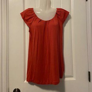 Alfred Sung orange shirt size small with gathering in sleeves for a dressier look. In between a shirt and tank top. Material is soft and quite stretchy. There's a 7.5 inch silver zipper in back. Been sitting in closet for a while but I remember only wearing it once.