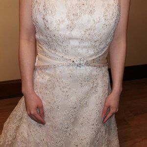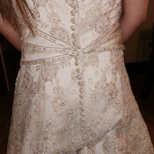 Alfred Sung princess style lace dress. Simply spectacular. Ivory and champagne. The detailed work is amazing with beads and sequence. Perfect for a petite woman. Veil included.