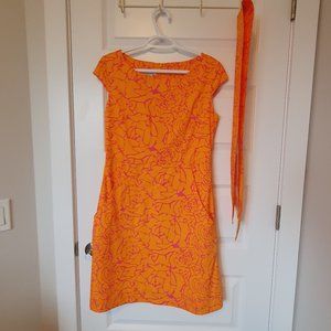 Adorable orange dress with pink floral print accent. Dress has 2 huge functional pockets.