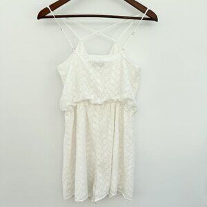 Ali & Jay Romper. This white, sleeveless one-piece boasts a delicate floral pattern, ideal for a touch of bohemian flair. The v-neckline adds a hint of sophistication, while the adjustable straps ensure a perfect fit for any body type. 100% polyester with a lace fabric, the romper is both comfortable and stylish. Suitable for a regular size M, this romper embodies a blend of elegance and playful charm. Fully lined. Pre-owned but in good condition. All measurements are in the photos above.