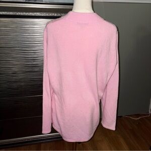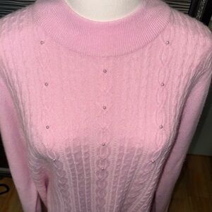 Cozy pink cable knit sweater with subtle embellishments. Perfect for a stylish and warm look.
