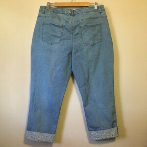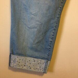 Very good preowned condition, light blue, cuffed capri with rhinestones or decor (in white, bronze and silver) on the cuffs by Alias. Includes a wide banded waist for flexibility and breathability.