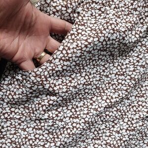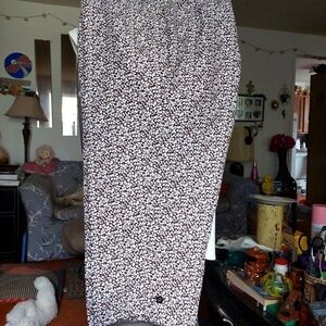 Brown/White Capri. 100% polyester. Size 18. (Personal opinion more 18W than regular 18). Elastic comfort waist. Alia.