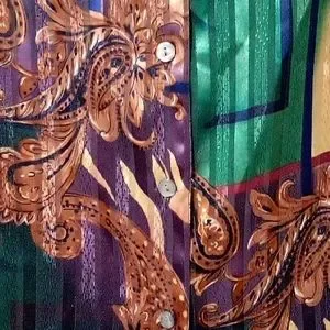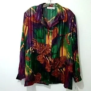 semi-sheer, striped, and paisley copper green purple. light shoulder pads, long-sleeve