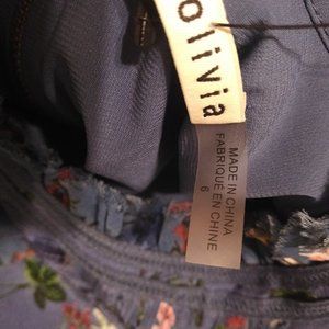 Charming blue dress with floral print. Features ruffled sleeves and hem. Perfect for any occasion.