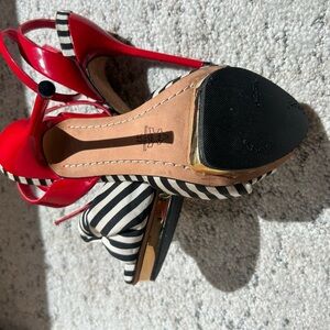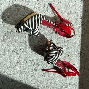 Alice + Olivia size 37 (6.5-7) by Stacy Bendant NEW no box sandals, showcasing a striking red and black color palette. The stiletto heel and ankle strap provide a secure fit, while the bold striped design adds a fashion-forward touch. Perfect for making a statement, these sandals are a standout addition to any outfit.