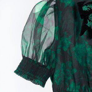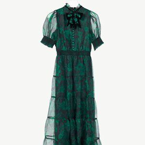This Coletta dress from Alice + Olivia is crafted with a silk organza in a Dream Floral Emerald pattern, and features short puffed sleeves with shirred cuffs, a ruffled mock neck, a removable embroidered velvet bow, front button closures, a shirred waist, a tiered A-line skirt, a maxi-length hem, an exposed back zip closure, and is lined in a tonal satin.