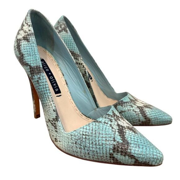 In excellent, like new condition. Alice + Olivia Dina turquoise snakeskin heels.ELooking to make a bold entrance? These heels will do just that. In these, you're the ultimate boss, no matter where you go, be that the office, or the cocktail lounge.