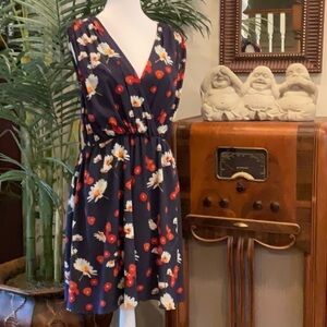 Beautiful Alice + Olivia sleeveless floral dress featuring a navy base with bright red and ivory daisies.
