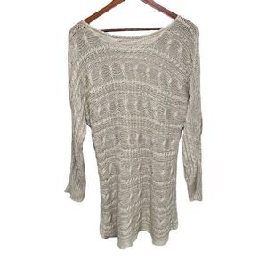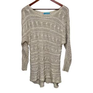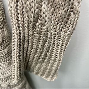 Elegant + high quality cable knit sweater that can easily be worn through the seasons. Slinky linen with wide neck + ribbed cuffs. Medium/ heavy weight. Hi-low hem. 100% linen