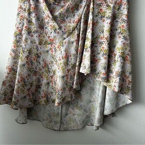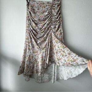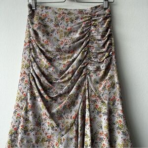 Elegant light gray skirt by Alice + Olivia. Features floral print, rushed front and asymmetrical hem.
