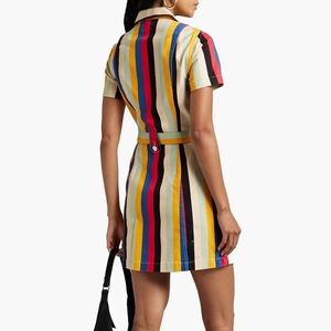 Vibrant striped mini dress. Features a belted waist. Short sleeves and zip front. Perfect for a bold look.