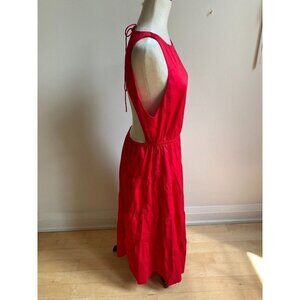 Hartley Open Back Tiered Midi Dress Crafted of cool cotton poplin, this tiered midi dress flaunts an open back with tie detail. MSRP $350 Color: Ruby (Red) Material: Cotton/elastane Length: Midi Crewneck Sleeveless Open back with tie closure Elasticized waist