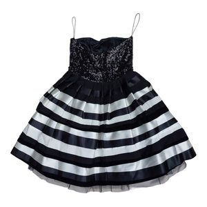 Alice and Olivia sequin dress with pleated striped skirt. Flowy bottom - hits around mid thigh. Strapless. Size 2.