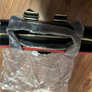This is a Loungefly Disney Alice in Wonderland - Villains convertible crossbody bag. This stunning bag is made with a durable faux leather that has a glitter red and solid black exterior. It features a colorful Alice applique on the front pouch with embossed direction signs. Around the pouch and on the sides pockets are silhouettes of the Queen of Hearts and her solders. The bag can be carried by its faux leather handles, or over the shoulder with the detachable shoulder strap or worn as a backpack. It has a large main compartment that is lined in fabric with a complementary print. A wonderful and very functional bag.