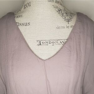 Flowy 100% silk with light grey soft rayon lining, scoop keyhole back, side slit sleeve detail, Worn Once, removed material tag, Size L, fits M/L better, Pit-18, Waist-12-18, Length-34.