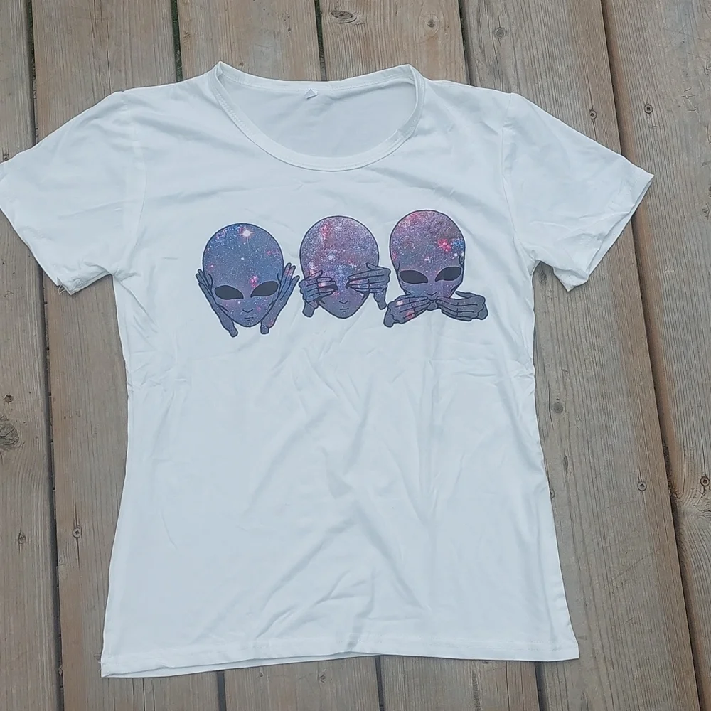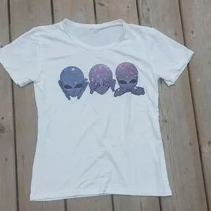 white short sleeved tee with alien graphic "hear no evil , see no evil, speak no evil"