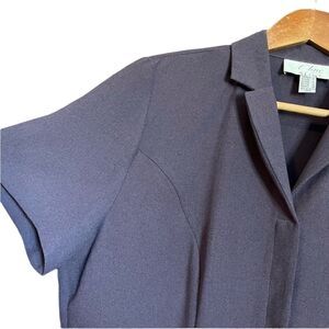 Elevate your wardrobe with this A-Line Petite by Algo Short Sleeve Purple Dress. In great pre-owned condition for a vintage piece, this dress features detachable shoulder padding for customizable style. Please note, there is a small flaw in the front where a brooch was previously attached, adding character to this unique dress.