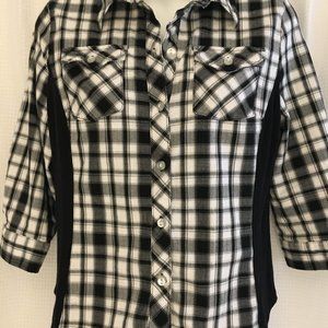 Size 6P. Preloved. Some piling. Ribbed contrasting black side panels. Button down, two front pockets (with buttons). Double-button 3/4 sleeve. Lots of life left! 22" length. Care tag removed. Cotton blend. machine wash cold, low tumble dry.