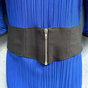 With echos of Issey Miyake’s pleated masterpieces, Alison Hayes Pleated Backless Dress. Decorative belt detail, front slit, lightweight material.