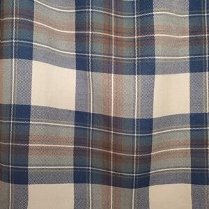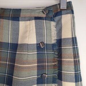 This pleated plaid skirt by Aljean Canada is a timeless piece that you’ll wear for years to come. The woven crisscross pattern is primarily teal blue and cream, with hints of brown and olive green. As a classic wrap-around skirt, it has hidden button and snap closures along the inside of the waistband, and three covered buttons down the front/side; the vertical edge of the skirt is finished with a subtle fringe.