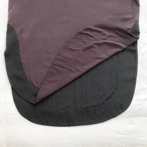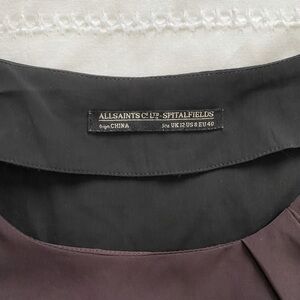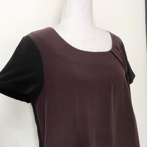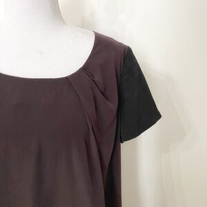 ALL SAINTS LACYN BLACK BROWN PANEL SHORT SLEEVE SHIFT DRESS, in a slightly high low style, this is a minimalist, classy, classic, sleek and neat neutral black & brown pannel lightweight short sleeve shift dress. Scooped hemline - and neckline - short sleeve - pull over style - unlined and not stretch yet flowy and loose fit / comfy yet structured with a one side pleated detail on the neckline for just a little bit of movement. Formal yet lowkey and versatile, wearable all year long from summer to winter - day to night business feminine dress to cocktail / first date/ dinner at a restaurant night out. Sophisticated.
