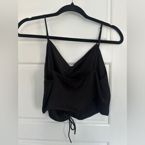This chic black camisole from All Saints features a stylish ruched front with a tie detail, offering a modern cropped silhouette. The soft, lightweight fabric and adjustable ruching make it perfect for warm weather, ensuring both comfort and style.