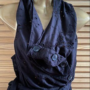 In broderie anglaise (fancy eyelet!) with a cowl neck and asymmetrical buttoning, this 100% cotton dress is a perfect summer thing for someone with confidence. UK 12/ US 8. Worn just twice! It needs proper undergarments as the lace is semi-revealing (see photo of me without!).