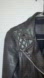 Chic dark leather jacket with quilted shoulders. Features zippered pockets and asymmetrical front zip. Stylish and versatile.