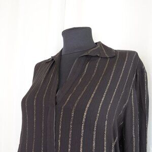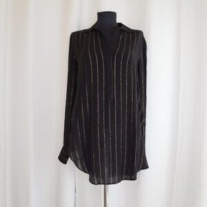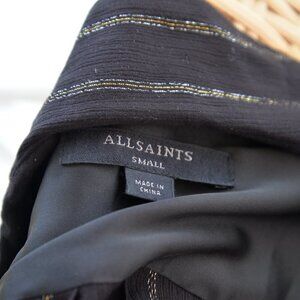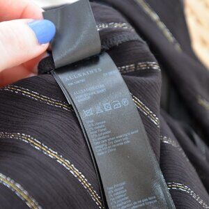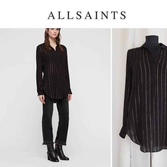 This striped "Keri" shirt by AllSaints is crafted from a semi sheer fabric, an all-over pinstripe in gold sparkle contrasts the black backdrop. Cut to a relaxed fit in a longline silhouette.