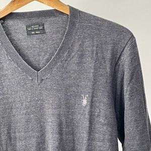 Classic lightweight V neck sweater in ultrasoft cotton. All Saints Ramskull logo in lighter grey on left chest. This is a beautifully made piece -- it will be a wardrobe staple for years to come.