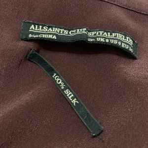 A purplr long sleeve button down v-neck blouse. Button closure on cuffs. Made of 100% silk. **Notice** There are some stains on armpits and at front.