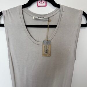 Keywords: All Saints grey dress, sleeveless minimalist dress, ruched back dress