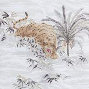 White tee with short sleeves. Features intricate embroidery of a palm tree 🌴 tiger 🐯 and bamboo
