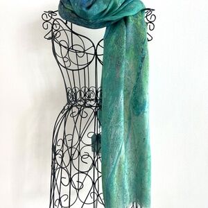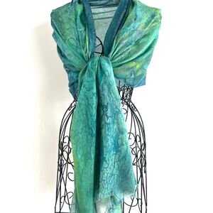 This scarf features a stunning cyan-turquoise palette, where blues and greens blend seamlessly together. Created from a custom print of my original painting "Blue Zone," it captures the serene beauty of oceanic hues.