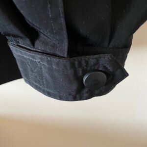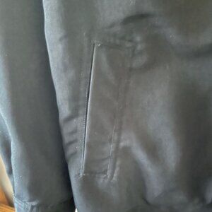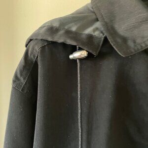 All Weather Woman Black Light Spring Coat – Size 18 - Sequence (Automme –Winter-Summer-Printemps )– 100% Polyester Shell– 100% Nylon Lining - has 2 slotted pockets plus 1 inside pocket - cuffs, neck and bottom can sized to fit comfortably - Measurements from under the arms - across chest 23”, side length from under arms 16”, sleeve length 15”, shoulder seam 6”, from neck to hemline 28 “, snap front buttons and buttoned removable hood, the shell has an overlay (front/back) – gives it more definition when wearing . Fits well – lots of room- can be worn over jackets – smoke/pet free home
